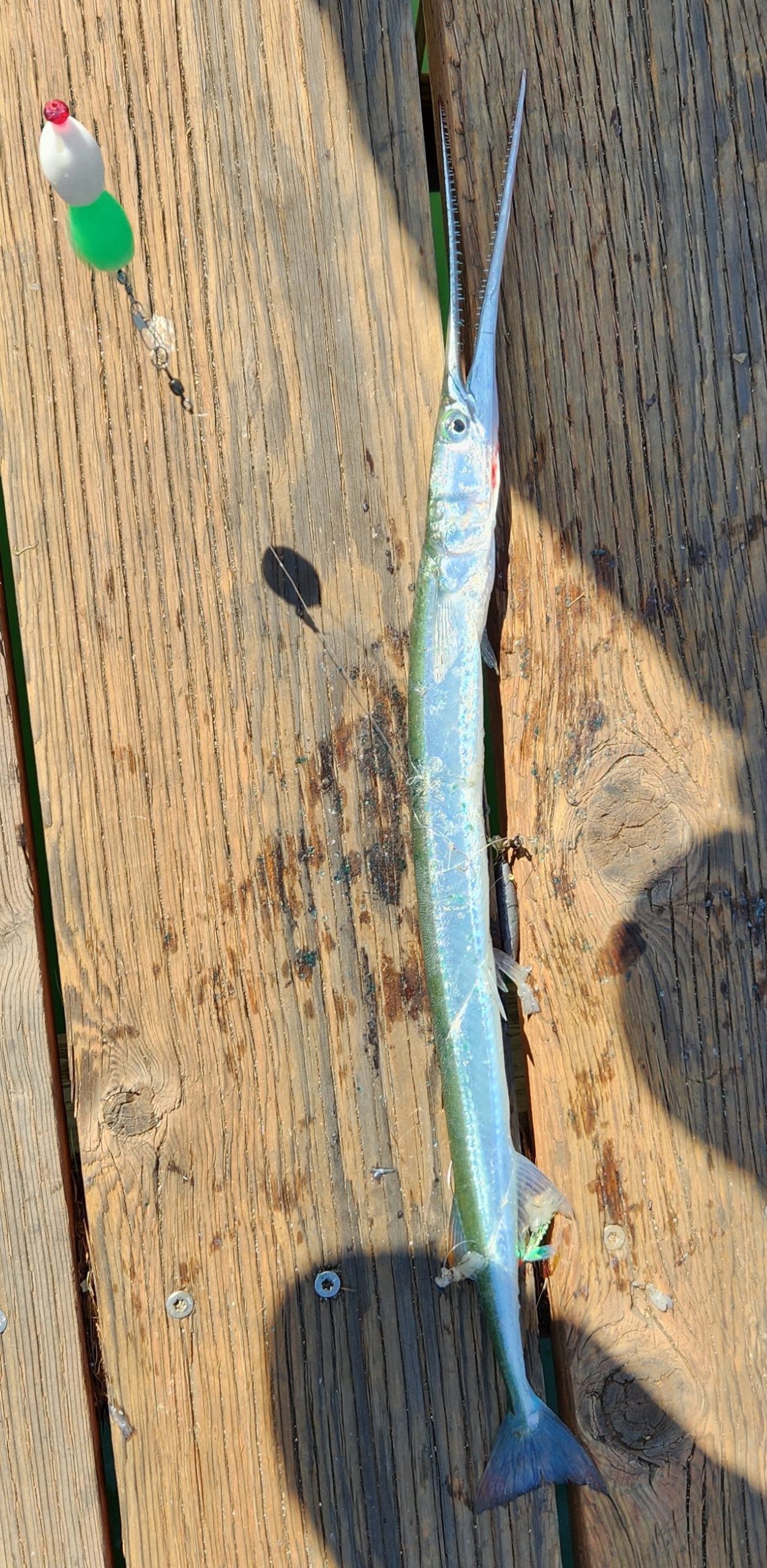 Received some Intel that Big Corvina around the pier. Brought my best surface lures. Fished today from 12pm to about 245 pm tossed everything for nothing. Only thing exciting was a big needlefish followed my Shimano waxwing lure, but it did not strike. Saw some major boils away from the pier. Saw two big mackerel caught on Sabiki rigs. One guy using shrimp caught 3 black croakers. A lady next to me caught a small needlefish. Cool looking fish.