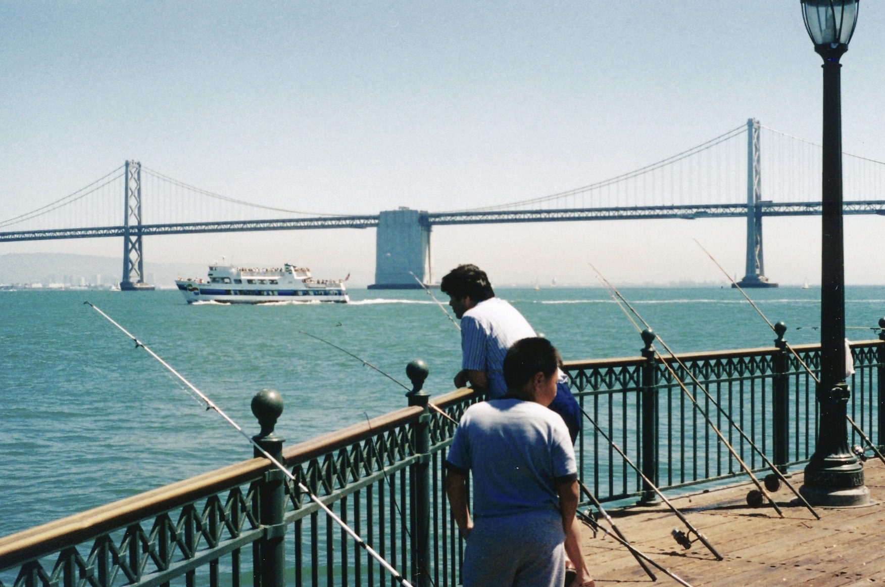 After one particularly large fish, I noticed what appeared to be a young Chinese man and woman standing nearby. They were nicely dressed, he in a casual suit, she in a pretty dress. I mistook them for business people taking a break—until they approached me. In a strong British accent they asked, “what are you catching?” It turned out they were tourists from London and on their first visit to San Francisco. What a lovely town and oh what beautiful weather. So unlike London’s overcast sky (and I must admit that the shirt-sleeve weather was pretty nice, even if I knew it was a very untypical mid-July day). By the way, could they catch a fish? They had never been fishing and thought it would be so much fun. No problem! Soon I hooked two jacksmelt, handed the pole to the lady, and she reeled in the fish. A proud picture was taken of her with her two fish. Next, a single, but larger, fish was hooked. Now the man reeled in the fish. He bragged that his was larger; she bragged that she caught two at a time, and it was picture time once again. Instant, successful, fisherpeople. But, I cautioned them, it isn’t always so easy. We quickly had become friends and they assured me that upon return to Britain they intended to give fishing another whirl. Such is life at this pier in the city that Herb Caen liked to call Baghdad-by-the-Bay. A never-ending panorama of people and stories.